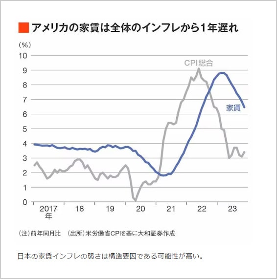 日本でも3年ぐらい前からインフレ率が高まり始めていますが、家賃があがるという動きに関しては、以前からある物件の家賃については変わっていないイメージではないでしょうか?しかし、アメリカでは全体のインフレから約1年弱のラグをもって家賃が変動する状況が続いています。